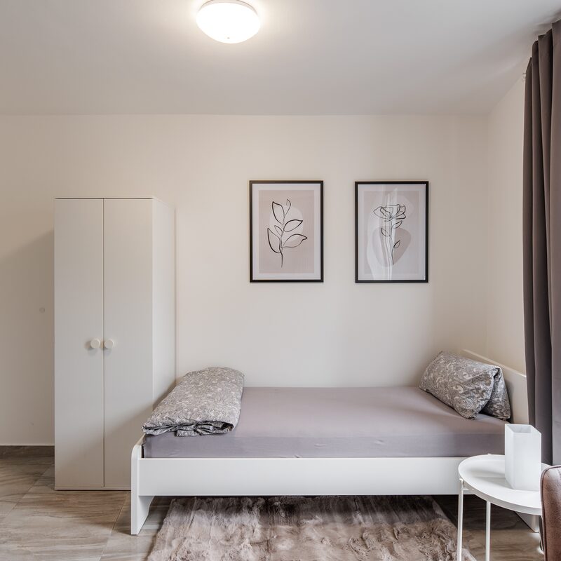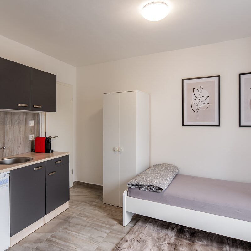 Vollständig ausgestattetes Apartment für maximal eine Personen mit einem Einzelbett (0.90m x 2.00m), eigener Küche sowie privatem en-suite Badezimmer.